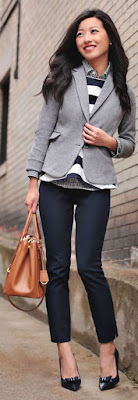 Il mio ultimo acquisto (d' impulso, devo ammetterlo) è stato un blazer grigio preso nei saldi. Il colore è un grigio medio, taglio classico, tessuto strutturato. Inizialmente non pensavo che mi sarebbe tornato così utile, finché non mi sia resa conto che potrebbe andar bene con la maggior parte dei miei vestiti.